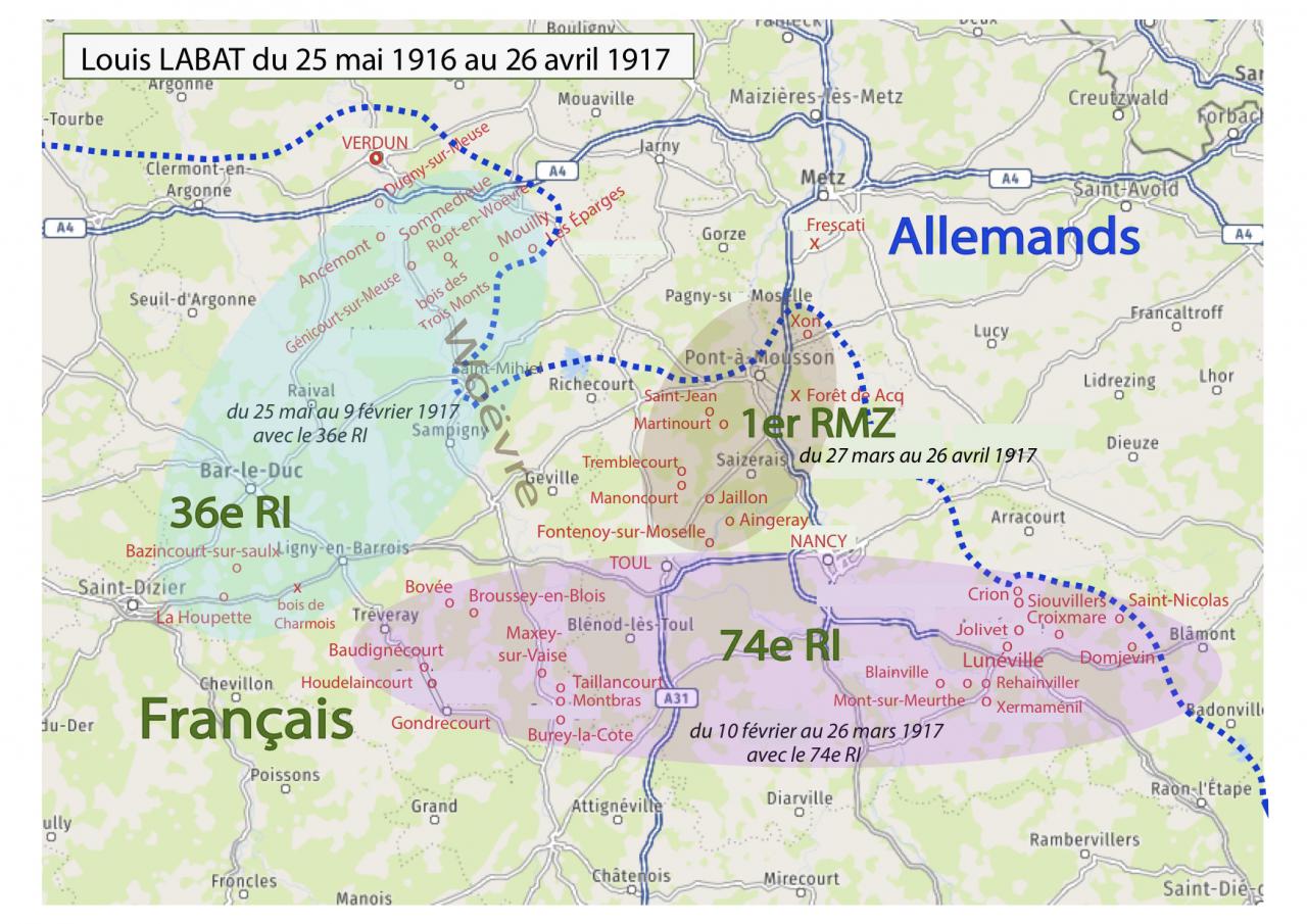 ◦ Le 30 mars, Louis LABAT change de nouveau de régiment : il passe au 1er Régiment de Marche de Zouaves (RMZ) (8*) qui fait partie de la 48e Div. Depuis le mois de février 1917, le 1er RMZ occupe le secteur de la Moselle à la forêt de Facq. Du haut de Xon, il surveille les vallées de la Moselle et de la Seille et signale à Nancy les avions ennemis prenant leur vol sur la base aérienne allemande de Metz-Frescaty. Le 1er RMZ est en instruction et manœuvres dans les alentours de ses cantonnements. Le 1er RMZ est composé des trois bataillons : le 4e Btn, le 5e Btn et le 11e Btn.