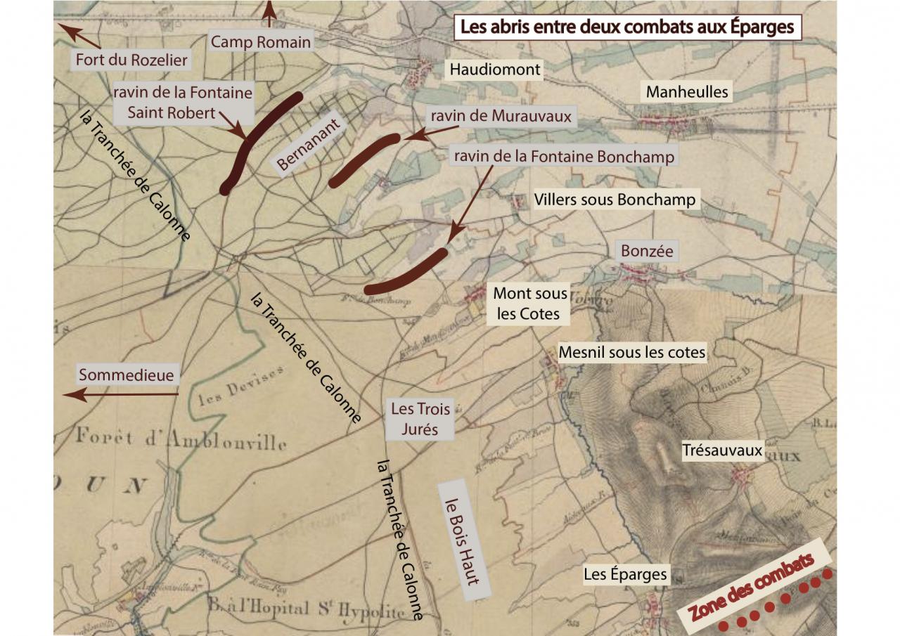 • nota (**) : la tranchée de Calonne est un chemin forestier qui part au sud-est de Verdun près de l'autoroute de l'Est, pour aller jusqu'à Hattonchatel à environ 20 km plus au sud. Elle porte le numéro RD331.